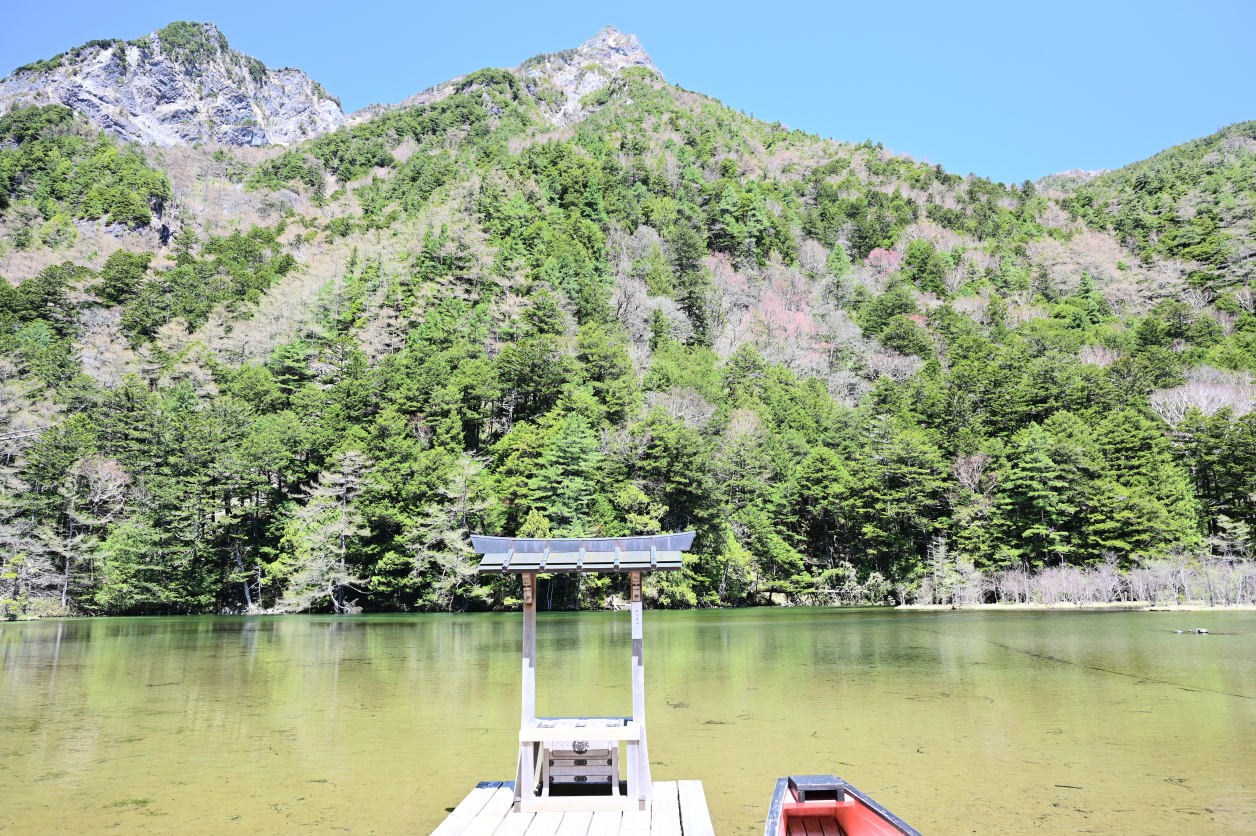 穂高神社奥宮を明神池から。一見、人がいないように撮ることができましたw