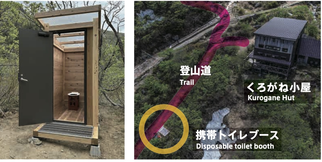 くろがね小屋付近。過去に事故があって火山性ガスが発生しているのか立ち入り禁止のようです。くろがね小屋は現在閉鎖していて、おトイレも簡易的なトイレブースが一つだけ設置されていました。