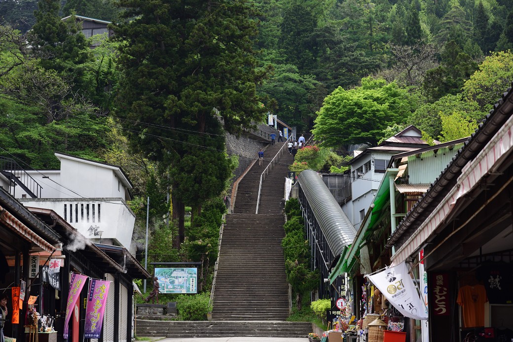 お山の中腹に色々あるのですが、写真の階段と、右側に有料のベルトコンベアがあります。お年寄りの方はベルトコンベアで運ばれてください。管理人は階段使用ですが、ベルトコンベアはアキレス腱が伸びる感じだそうですw