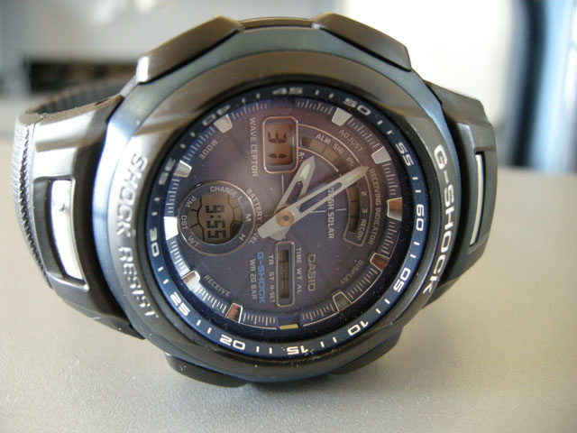 所謂、電波・タフソーラー搭載で電池交換や時間調整が不要の便利なG-SHOCKです。裏ブタは鍛造ステンレススチールでやけに分厚く、頑丈そうです。3時位置と9時位置にLEDなのかな?ライトが付いていて、通常のG-SHOCKのように文字盤が光るのではないモデルです。